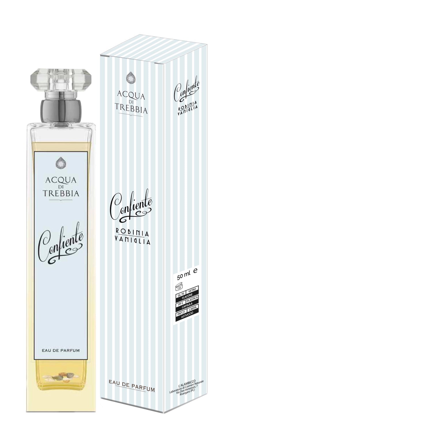 Confiente Eau de Parfum, prende il nome dalla confluenza dei fiumi Aveto e Trebbia, dando luogo a scenari meravigliose e acque balneabili cristalline della nostra Val Trebbia.